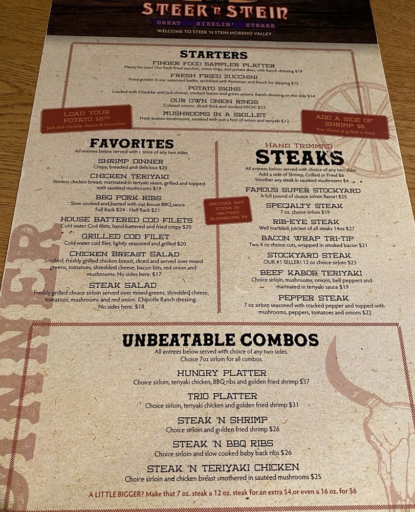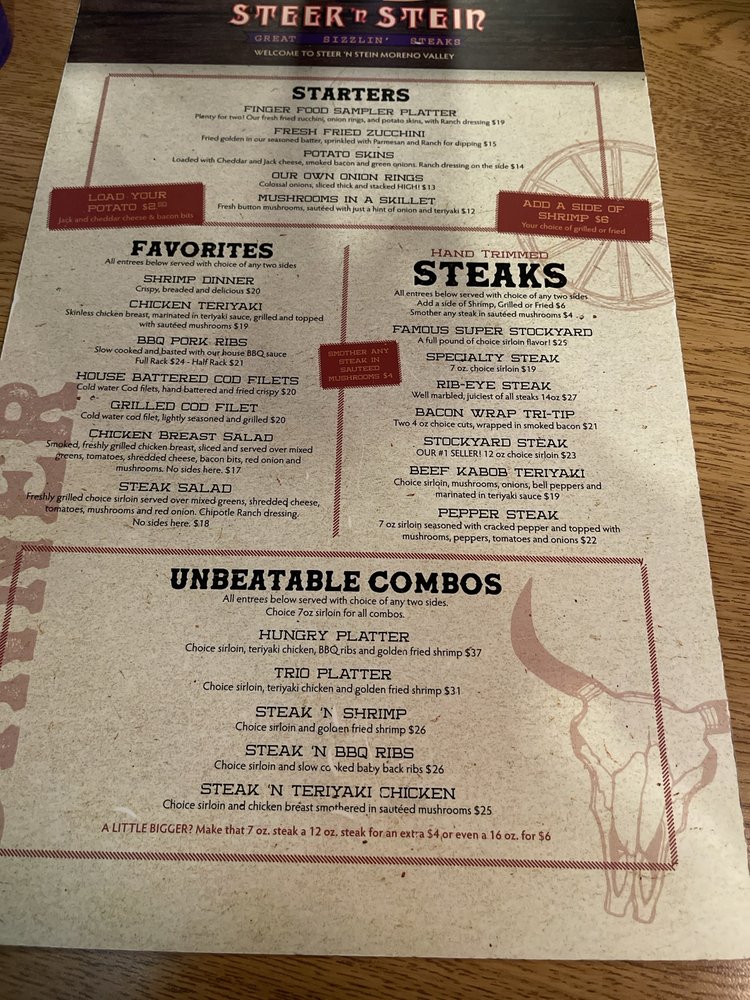 Introducing the menu at Steer’n Stein, where American steakhouse tradition meets a warm, casual ambiance. Located in Moreno Valley, this inviting eatery welcomes diners with its mouthwatering selection of steaks, including the beloved Porterhouse, cooked to perfection. With many vegetarian options available, it's a destination for everyone.